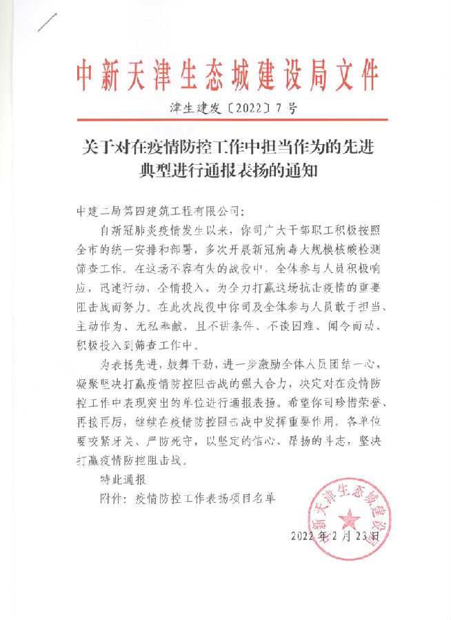 近日,公司收到來自中新天津生態(tài)城建設(shè)局的文件。文件對公司天津貽成學(xué)府項(xiàng)目在疫情防控工作中主動擔(dān)當(dāng)作為的突出表現(xiàn)給予肯定。